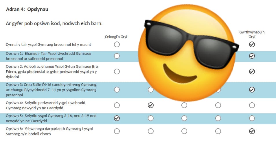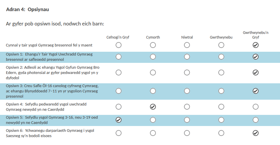 - Adran 4: Opsiynau yw’r adran fwyaf arwyddocaol o’r arolwg. Dyma’r ymatebion mae’r ymgyrch yn argymhell: